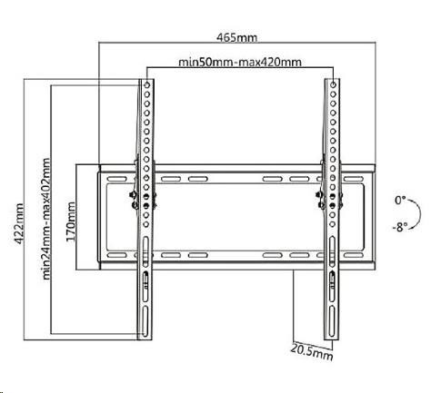 Náklopný držák Tv Fiber Mounts F7M74 Sklopný držák na televize s hmotností až 35kg a podporou VESA 75x75 až 400x400 Univerzální sklopný držák pro zavěšení všech typů televizorů - LCD, LED, plazmové, smart, 3D, prohnuté i OLED a QLED.. Po zavěšení televize na držák je možné obrazovku mírně naklopit až o 8° směrem dolů. Držák má ocelovou konstrukci, kterou je možné dát televize s hmotností až 35kg. Podporuje zavěšení všech televizorů s VESA standardem 75x75 až 400x400. Barevné provedení černé. Záruka 10 let. Držák dodáváme včetně veškerého instalačního materiálu - hmoždinky, vruty, sada šroubů a podložek. Levný držák na Tv s naklopením Fiber Mounts F7M74 Technické údaje: nosnost 35kg podporuje VESA standardy 75x75 až 400x400 ideální na Tv s úhlopříčkou 19" až 55" univerzální, zavěšení všech typů televizorů možnost naklonění obrazovky směrem dolů od 0° do -8° vzdálenost televizoru od zdi 21mm je opravdu malá, ale dostatečná pro spolehlivé odvětrávání konstrukce držáku je ocelová zajištění televizoru proti vysazení - 2x šroub rozměr držáku pro uchycení na stěnu 465x170mm barevné provedení černé záruka 10 let Držák Tv podporuje VESA standardy pro zavěšení: VESA 75x75 VESA 100x100 VESA 200x100 a 100x200 VESA 200x200 VESA 300x200 a 200x300 VESA 300x300 VESA 400x200 a 200x400 VESA 400x300 a 300x400 VESA 400x400.