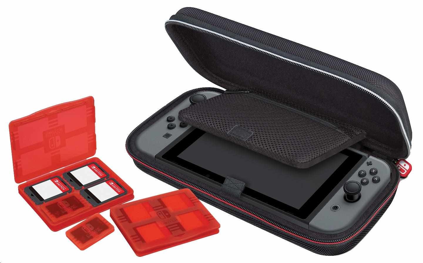 V tomto luxusním cestovním pouzdru můžete bezpečně a bez obav převážet svou oblíbenou herní konzoli Nintendo Switch™. Polstrovaný oddělovač uprostřed pouzdra chrání obrazovku konzole před poškrábáním a v síťované kapse na zip na jeho druhé straně si můžete uschovat karty s dalšími hrami.