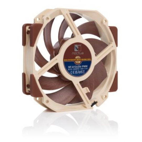NF-A12x25r je verze s kulatým rámem oceňovaného modelu 120mm ventilátoru Noctua NF-A12x25. Díky svému kulatému tvaru je ideální pro použití na dvouvěžových chladičích CPU s nízkou výškou, jako je NH-D12L, a také na jiných prostorově omezených aplikacích, které nemohou pojmout 120mm ventilátory se čtvercovým rámem. Stejně jako čtvercový NF-A12x25, kulatý NF-A12x25r využívá rekordně těsnou vůli špičky pouze 0,5 mm, což je možné díky použití nové směsi tekutých krystalů (LCP) Sterrox®. NF-A12x25r, který sdílí stejný nejmodernější design oběžného kola s kanály pro zrychlení průtoku, dosahuje stejného nejlepšího tichého chladicího výkonu ve své třídě jako jeho sourozenec se čtvercovým rámem. Podporuje také plně automatickou regulaci rychlosti pomocí PWM hlavičky ventilátoru a je dodáván s nízkohlučným adaptérem pro snížení maximální rychlosti z 2000 na 1700 ot./min. NF-A12x25r, doplněný výjimečně hladkým chodem, ložiskem SSO2 referenční třídy Noctua, bohatým balíkem příslušenství a 6letou zárukou výrobce, je skrz naskrz produktem prémiové kvality. Jeho vynikající účinnost, špičková konstrukce a průkopnické materiály z něj dělají elitní volbu pro všechny 120mm aplikace, které vyžadují kulatý rám.