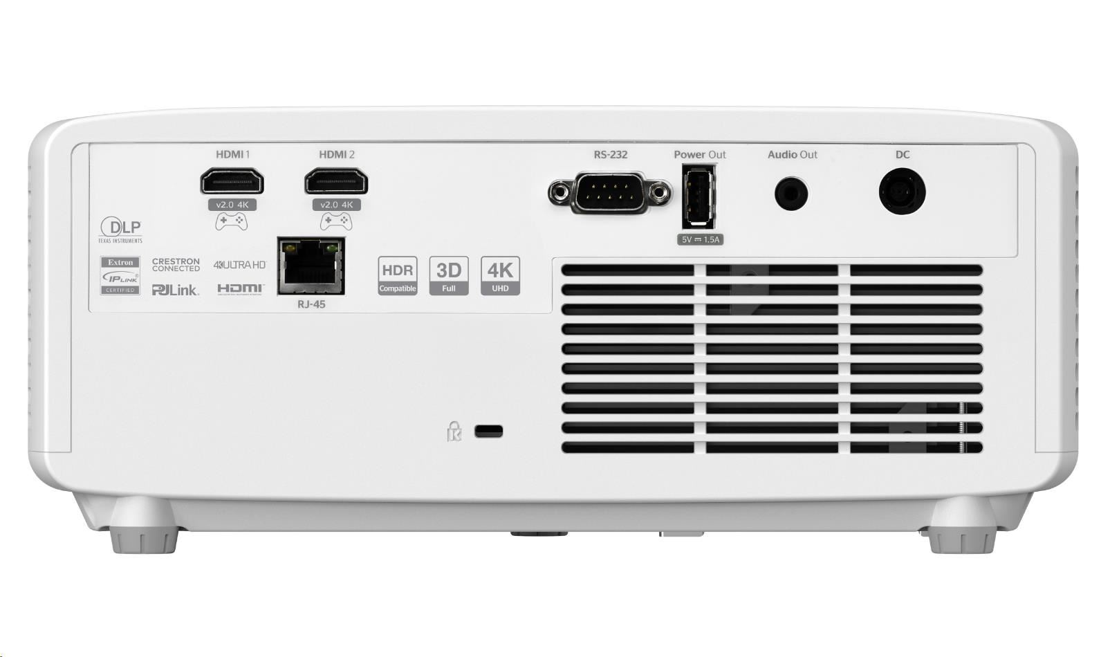 Použití projektoru:Business / kancelářský / školní; Typ projekce:Krátká (ST); Skutečné rozlišení projektoru:4K UHD (3840x2160); Projekční poměr:16:9; Projekční vzdálenost (min) (m):0,4; Projekční vzdálenost (max) (m):3,3; Úhlopříčka obrazu (max) ("):300; Technologie:DLP; Zdroj světla:Laser; Kontrast (hodnota : 1):300000.... více