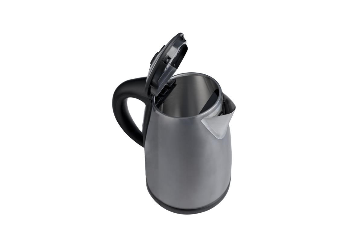 Elektrická varná konvice - šedá. Varná nádoba z ušlechtilé nerezové oceli. Objem 1,7l. Otevírání vrchního víka konvice stisknutím tlačítka. Varná nádoba na odnímatelném 360° otočném podstavci. Topné těleso překryté plotnou s ušlechtilé oceli. Stupnice hladiny vody. Ochrana před ohřevem bez vody. Auto vypnutí. Vyjímatelné filtrační sítko na vodu. Síťová šňůra odkladatelná v podstavci. Napájení 230V 50 Hz, 2000 W.