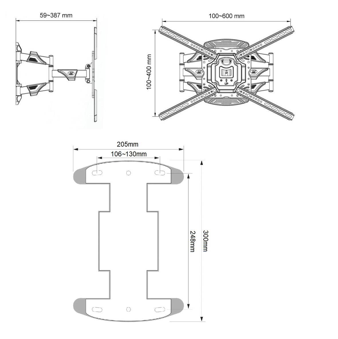 Profesionální nástěnný otočný sklopný držák na televize NB NBP5 Držák na Tv 32-70", VESA 100*100 až 600*400, nosnost 36,4kg, otočný +/-45°, sklopný +3°/-5°, výsuvný od 59 do 387mm, korekce roviny, úchyty na kabely, certifikovaný držák TUV ISO9001 Celoocelový držák pro naprosto spolehlivé a bezpečné uchycení televizorů 32-70" na stěny. Držák Vám umožní snadnou manipulaci s televizorem - otáčení do stran, naklápění, vysouvání a zasouvání, úprava roviny. Ramena držáku jsou osazena úchytkami na kabely, nástěnný úchyt je osazen designovými kryty. Držák podporuje VESA standardy Tv 100x100 až 400x400 a zavěsit můžete i televize s hmotností 36kg. Velmi kvalitní nástěnný držák na televize, otočný sklopný a výsuvný NBP5 Technické údaje: nosnost 36,4kg na televize 32" až 70" podporuje VESA standardy pro uchycení Tv 100x100 až 600x400 snadná manipulace s televizorem otáčení do stran +/-45° naklápění +3°/-5° vysouvání a zasouvání ke zdi od 59mm až do 387mm úprava roviny televize +/-3° úchytky na kabely designový kryt nástěnného úchytu extrémní pevnost a naprostá spolehlivost, vynikající kvalita celoocelové provedení instalační materiál součástí balení (hmoždinky, vruty, sada šroubů a podložek) certifikovaný držák TUV, ISO9001 barva černá záruka 5 let Špičkový držák na televizi se snadným polohováním televize NBP5 Tv držák NBP5 podporuje VESA standardy pro zavěšení televizorů: VESA 100*100 VESA 200*100 a 100*200 VESA 200*200 VESA 300*200 a 200*300 VESA 300*300 VESA 400*200 a 200*400 VESA 400*300 a 300*400 VESA 400*400 VESA 600*400 Držák na televizi NB NBP5 Balení obsahuje sadu instalačního materiálu: 4ks šroubů M4, M5 a M6 s délkou 25mm 4ks šroubů M8 s délkou 30mm 4ks podložek a 4ks distančních válečků 1ks klíč 10mm 4ks vrutů do hmoždinek 7x70mm 4ks hmoždinek (do cihly nebo betonu) Pokud z výše uvedené šrouby z balení nebudou pro uchycení Vaší televize vhodné, je nutné abyste si šrouby v potřebné délce a průměru zakoupili sami - bohužel výrobci Tv používají různé průměry a délky..