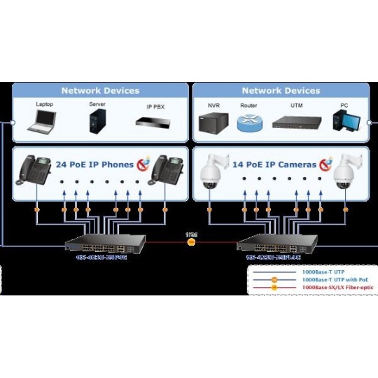 Gigabitový spravovatelný přepínač s PoE (power over ethernet) porty pro centralizované napájení zařízení po ethernetu jako jsou IP kamery, WiFi prvky nebo VOIP telefony. Zařízení je svým provedením vhodné jak pro instalaci do kancelářských nebo prezentačních prostorů. Je vhodné i pro aplikace v lokálních rozvaděčích, připojení lze realizovat optickýmy porty SFP. Bezpečnou správu zajistí šifrovaná webová správa nebo SNMPv3 protokol. Připojení koncových uživatelů lze zabezpečit ACL/MAC pravidly nebo možnou autorizací na server RADIUS/TACACS. Vlastnosti: - 28 portů 1000Base-T, Switching, Full Duplex (1000/2000 Mbps), Auto-Negotiation (10/100/1000 Mbps) - 24x vestavěné PoE injektory 802.3at, každý injektor až 30W/port; celkový max. napájený výkon až 440W - 4x SFP sdílené s metalickými (25-28), 100/1000Base-X, pro instalaci optických modulů mini-GBIC s označením MFB a MGB - Auto-MDI/MDI-X, automatická detekce přímý skřížený kabel i pro 10/100Mbps - ESD ochrana na všech portech do 2kV DC - 8k MAC adres, 4,1MB buffer - propustnost: 52Gbps sběrnice, datově 42Mp/s (64B) - podpora přenosu Jumbo rámců o velikosti 10KB - správa: WEB / SNMPv3 / telnet / konzole; podpora SSL/SSH - podpora protokolů IPv4/IPv6 - VLAN IEEE 802.1Q, až 256 skupin, až 4094 VLAN ID; protokolové, VoIP a privátní VLAN - agregace portů LACP 802.3ad, až 8 skupin po 8 portech - QoS 8 front, klasifikace podle provozu, váženého průměru nebo značky VLAN - Spanning tree protokol: STP IEEE 802.1D / RSTP IEEE 802.1w / MSTP IEEE 802.1s - IGMPv3 Snooping, Querier, až 256 multicast skupin - zrcadlení portů-port mirroring TX/RX/TX+RX/více na jeden port - zabezpečení klientů: ACL (access control list), MAC statická tabulka pro autorizovaná zařízení, autorizace na RADIUS/TACACS+, DHCP snooping, spojení IP+MAC na porty - ochrana proti DoS útokům - pole LED indikátorů pro diagnostiku provozu - tepelná ochrana proti přehřátí - rozměry: (440 x 300 x 44,5)mm, montáž 19"/1U - hmotnost 4,8kg - provozní teplota: 0-50°C - interní napájecí zdroj AC 110-240V/50-60Hz, vlastní příkon asi 30W.