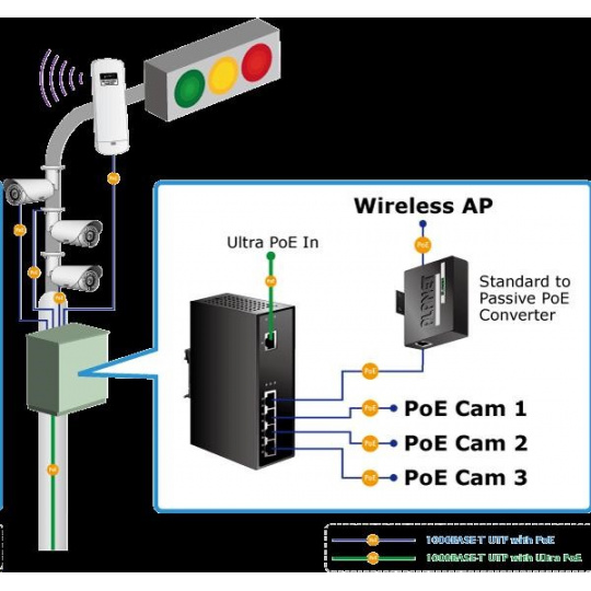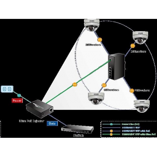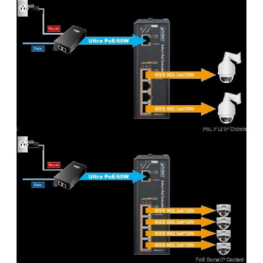 Průmyslový Power over Ethernet extender IEEE 802.3at se 4-portovým gigabitovým přepínačem a injektory pro další napájení zařízení po ethernetu. Injektory lze zatížit do 60W v kombinaci 2x 802.3at zařízení po 30W nebo 4x 802.3af zařízení po 12W. Designovaný pro použití s kamerami PTZ, dotykovými monitory, VoIP aparáty nebo WiFi přístupovými body v terénu a na težko dostupných místech. Provoz extenderu je možný při teplotách od -40 do 75°C, je odolný vůči vibracím, přetížení a externím mechanickým vlivům; všechny porty obsahují ESD+EFT ochranu proti přepětí a elektrostatice. Extender se napájí přímo pomocí PoE UltraPower injektorem (60W) Planet POE-171 nebo POE-173! Parametry: - Ethernet rozhraní: 1x napájecí PoE vstup (Ultra Power 60W); 4x injektory - celková zatížitelnost inejktorů 60W (2x 30W nebo 4x 12W) - slučitelné s IEEE 802.3u, IEEE 802.3ab 1000Base-T, IEEE 802.3af, IEEE 802.3at - instalace na DIN lištu nebo na zeď, montážní díl součástí - krytí IP30, skříň celohliníková - zařízení je odolné proti pádu (IEC-60068-2-32) z výšky 75cm na všechny dopadové části - zařízení je odolné proti vibracím (IEC-60068-2-6) 10-500-10Hz, 4x g, 0,5oct/min - zařízení je odolné proti přetížení krátkodobému zrychlení 50x g, dlouhodobému 4x g (IEC-60068-2-27) - integrována ochrana EFT/ESD proti zavlečení cizího napětí a proti rychlým přechodovým jevům do 6KV DC - EMI/EMS, elektromagnetická kompatibilita a slučitelnost dle CE EN-6100-4-2,3,4,5,6 - elektrická bezpečnost dle CE EN-60950 - LED indikace zatížení - pracovní teplota -40 až 75°C, vlhkost do 95% - rozměry: 135 x 87.8 x 56 mm - hmotnost 715g - napájení PoE IEEE 802.3at, 60W UltraPower injektorem (Planet POE-171 nebo POE-173).
