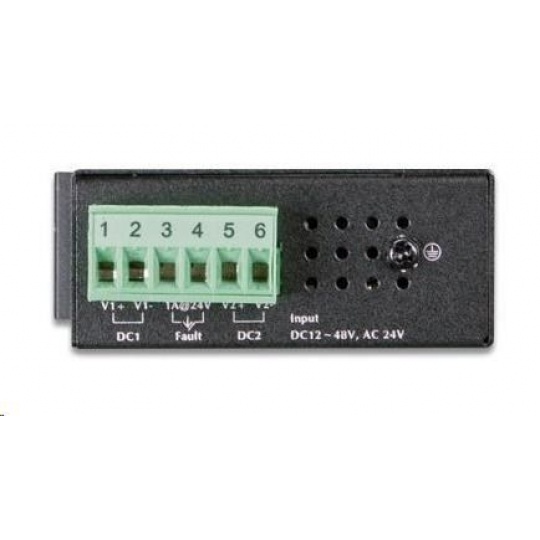 5portový 100Mbitový přepínač a konvertor pro průmyslové aplikace. Možnost redundantního napájení DC 12-48V / AC 24V, příkon <2W.