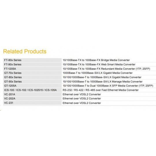 - PLANET Fast Ethernet, Gigabit Ethernet Media Converter series: FT-80x / FT-90x / FT-1205A and GT-70x / GT-80x / GT-90x / GT-1205A