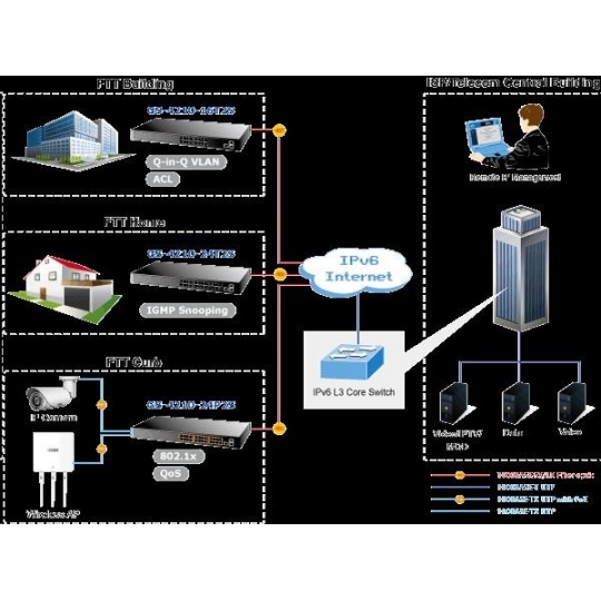Gigabitový spravovatelný přepínač pro instalaci do náročnějších lokálních sítí, disponuje širokou škálou funkcí pro zajištění provozu bezpečné sítě eliminací možných útoků na nižších vrstvách modelu OSI a možnou autentizací koncových zařízení. Připojení koncových uživatelů lze zabezpečit ACL/MAC pravidly nebo možnou autorizací na server RADIUS/TACACS. Bezpečnou správu zajistí šifrovaná webová správa nebo SNMPv3 protokol prostřednitcvím IPv4 nebo nově IPv6 protokolem. náhrada za GSW-2404SF - 24 portů 1000Base-T, Switching, Full Duplex (1000/2000 Mbps), Auto-Negotiation (10/100/1000 Mbps) - 2x SFP, 100/1000Base-X, pro instalaci optických modulů mini-GBIC s označením MFB a MGB - Auto-MDI/MDI-X, automatická detekce přímý skřížený kabel i pro 10/100Mbps - 8k MAC adres, 4,1MB buffer - propustnost: 52Gbps sběrnice, datově 38,6Mp/s (64B) - podpora přenosu Jumbo rámců o velikosti 9KB - správa: WEB / SNMPv3 / telnet / konzole(COM port); plná podpora protokolů IPv4/IPv6 - VLAN IEEE 802.1Q, až 256 skupin, až 4094 VLAN ID, protokolové VLAN, VoIP-VLAN - agregace portů LACP dle IEEE 802.3ad, až 8 skupin po 8-mi portech - QoS 8 úrovní pro 8 front; klasifikace podle provozu, váženého průměru nebo příznaků IEEE 802.1p a DSCP - Port shaper: datová limitace rychlosti - Spanning tree protokol IEEE 802.1D: STP / RSTP / MSTP - IGMPv3 Snooping, Querier, až 256 multicast skupin - podpora LLDP protokolu - zrcadlení portů-port mirroring: TX / RX / TX+RX - zabezpečení klientů: ACL (access control list), MAC statická tabulka pro autentizovaná zařízení, podpora ověření vůči serverům RADIUS/TACACS+, DHCP snooping - ochrana DoS proti útokům v síti, StormControl proti eliminaci chybných provozů - pole LED indikátorů pro diagnostiku provozu - ESD ochrany proti statické elektřině - rozměry: (445 x 207 x 45)mm, hmotnost 2,1kg - provedení rackmount 19"/1U - provozní teplota: 0-50°C - interní napájecí zdroj AC 110-240V/50-60Hz, vlastní příkon do 14W - fanless: žádný ventilátor.