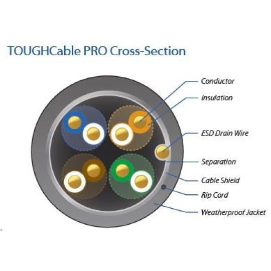 TOUGHCablePRO je speciálně designovaný stíněný FTP kabel kategorie Cat5e pro extrémní nasazení do nejnáročnějších meteorologických podmínek zásadně eliminující rizika poškození venkovních aktivních prvků přepětím (ESD).