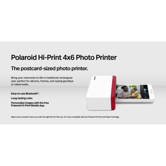 Fototiskárna Polaroid Hi-Print 4x6 oživí vaše vzpomínky v tradiční obdélníkové velikosti: ideální do alb, rámečků a na rozloučenou s holými zdmi. K tiskárně se snadno připojíte prostřednictvím přiložené mobilní aplikace Polaroid Hi-Print a své fotografie budete mít k dispozici během okamžiku. A začněte ihned tisknout s přiloženou papírovou kazetou Polaroid Hi-Print 4x6 - 80 listů. Tato stylová fototiskárna 4x6 okamžitě zmodernizuje váš pracovní stůl bez ohledu na to, jak nepořádný je život. Kompatibilní pouze s papírovou kazetou Polaroid Hi-Print 4x6.
