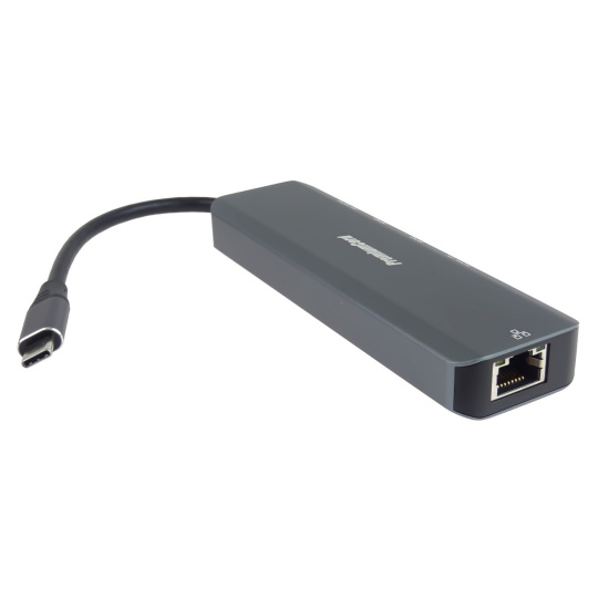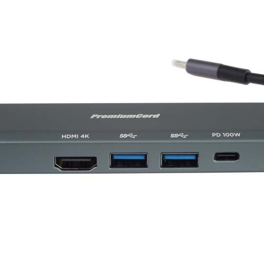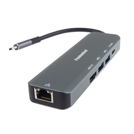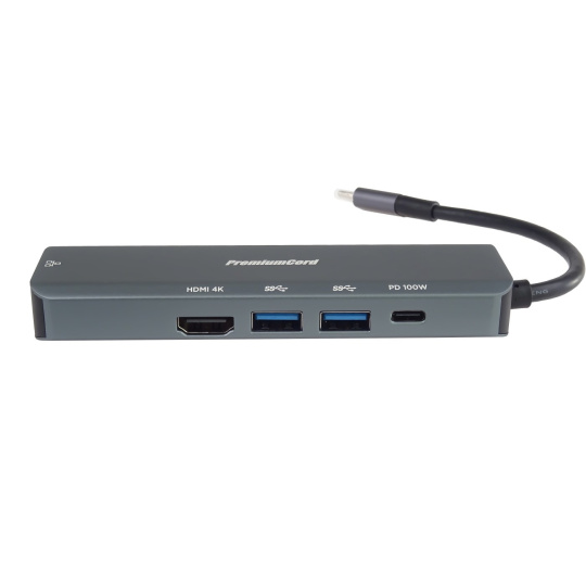 PREMIUMCORD Adaptér USB-C na Gigabit 10/100/1000Mbps + 1x HDMI, 2x USB3.2, 1x PD 100W konektor, Šedá