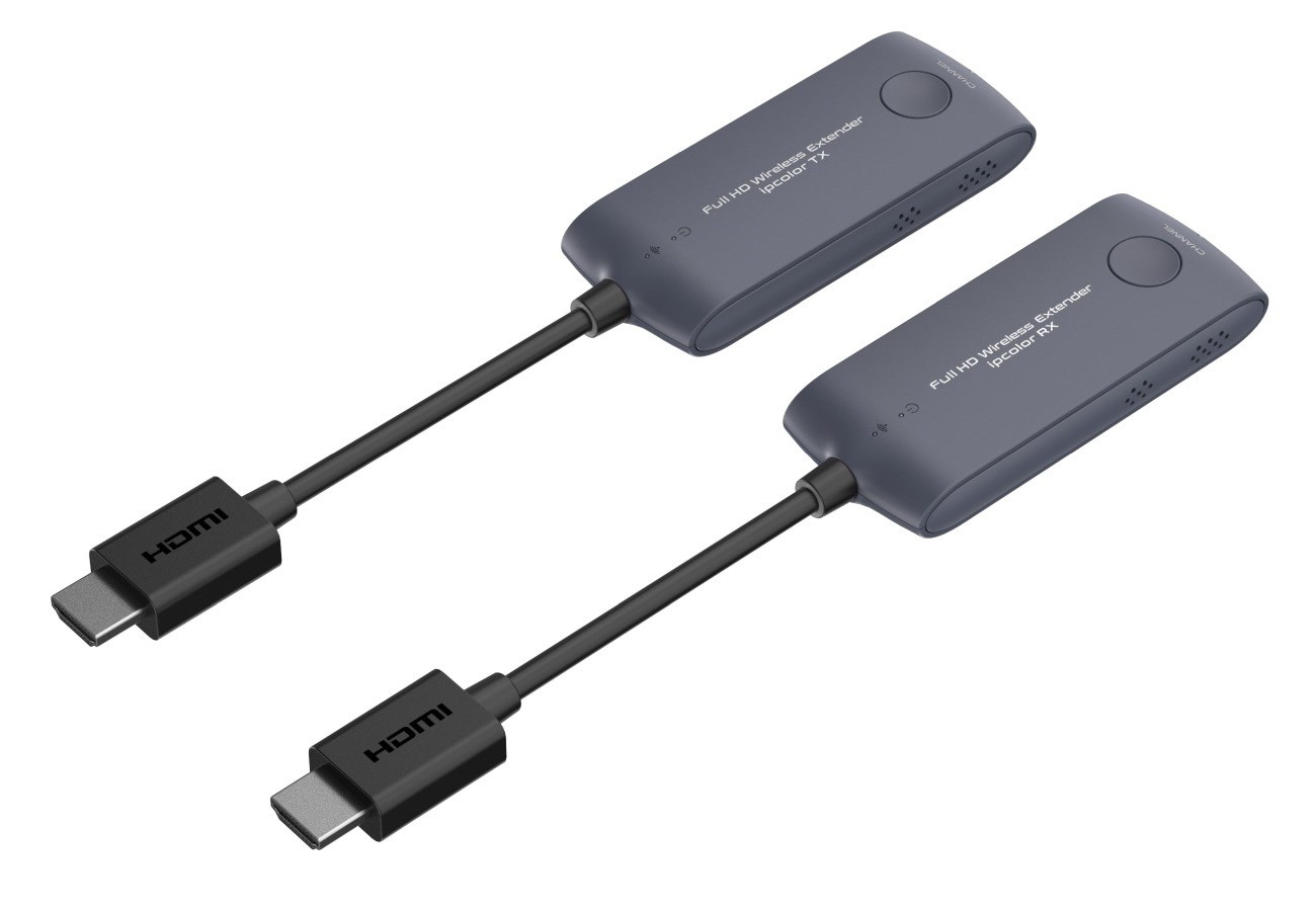 - Vysílací a přijímací adaptéry mají krátký HDMI kabel pro snadné zapojení do počítače a zobrazovače nebo TV.