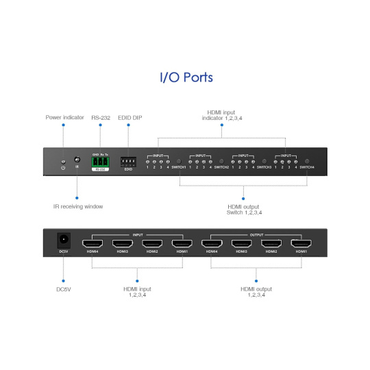 Ovládání pomocí dálkového ovladače nebo čtyřmi tlačítky na předním panelu přepínači, je možné nastavit libovolný vstup na jeden ze čtyř výstupů. Přepnutí je ihned signalizováno LED diodami, které představují číslo vstupu, který je aktuálně přepnut na výstup.
