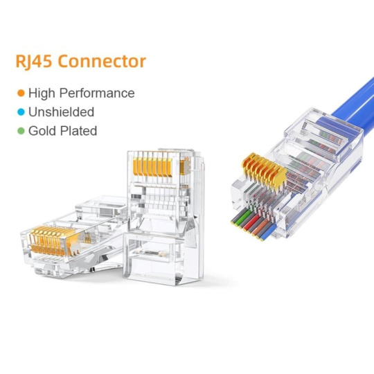 PremiumCord modulární RJ45 konektor (8P8C) pro kabely kategorie Cat6 je navržen pro čisté a spolehlivé zakončení síťových kabelů. Tento průchozí konektor usnadňuje krimpování: vodiče procházejí skrz konektor, takže lze snadno ověřit jejich pořadí a zajistit správný kontakt. Transparentní tělo umožňuje vizuální kontrolu zapojení vodičů, což minimalizuje chyby při instalaci.