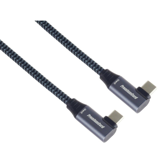 PremiumCord USB-C 2x zahnutý 90° kabel ( USB 3.2 GEN 2x2, 5A, 100W, 20Gbit/s ) hliníkové krytky konektorů, bavlněný oplet, 3m