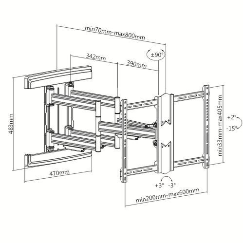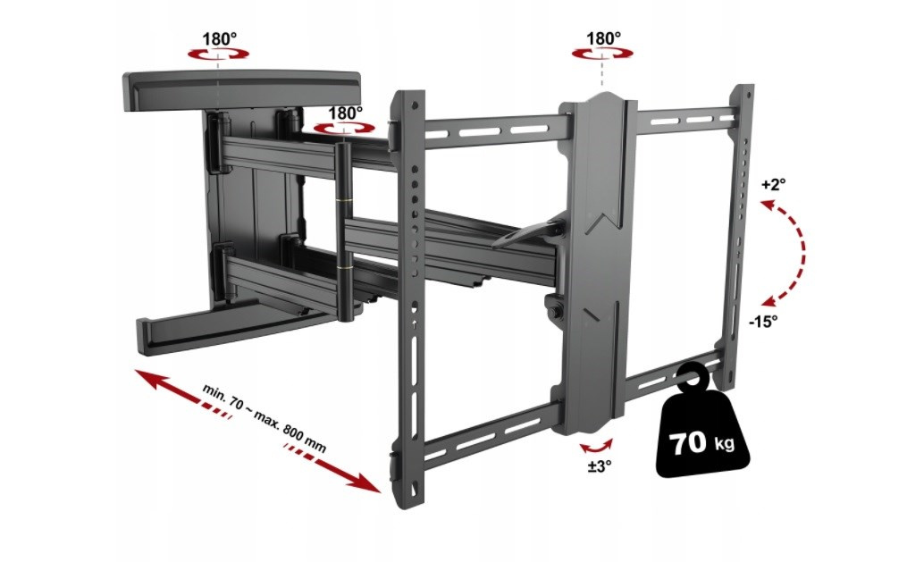 Profesionální držák Tv Fiber Novelty Noston Profesionální nástěnný držák na Tv 43-90", otočný, sklopný, délkové nastavení, korekce roviny, vedení kabeláže, krásný design a špičková kvalita, VESA standardy 200x100 až 600x400, nosnost 70kg Plně nastavitelný držák na všechny typy televizorů s úhlopříčkou 43" až 90", který je v krásném designu a přitom poskytuje opravdu EXTRA pevné a bezpečné zavěšení televizorů s hmotností až 70kg. I při této zátěži můžete každou zavěšenou televizi vysunout od zdi od minimální délky 70mm až po neskutečných 800mm. Tento držák v délkovém nastavení předčí naprostou většinu držáků přitom za zlomek ceny těchto držáků. Televizi můžete otáčet do stran a naklápět. V případě nepřesné instalace má držák systém pro korekci roviny obrazovky. Polohování je snadné a zvládnou to i děti, přitom budete mít vždy jistotu naprosté bezpečnosti i u největších a opravdu těžkých televizorů. Ramena držáku jsou osazena krytkami pro vedení kabeláže. V balení naleznete i montážní materiál. Barevné provedení černé. Záruka 5 let. Profesionální držák na televize v nejvyšší kvalitě a špičkovém provedení Technické údaje: nosnost 70kg podpora VESA standardu 200x100 až 600x400 doporučujeme na Tv s úhlopříčkami 43" až 90" nastavení vzdálenosti od zdi 70-800mm otáčení Tv do stran +/-75° možnost náklonu obrazovky + 2° až - 15° korekce roviny obrazovky + 3° až -3° systém pro vedení kabeláže extrémně pevná a spolehlivá konstrukce nejvyšší bezpečnost velmi pěkný design profesionální polohovatelný držák na televize barevné provedení černé montážní materiál součástí balení záruka 5 let Profesionální otočný sklopný a výsuvný držák na televize Fiber Novelty Noston Televizní držák Fiber Novelty Noston podporuje VESA standardy: VESA 200x100 VESA 200x200 VESA 300x100 a 100x300 VESA 300x200 a 200x300 VESA 300x300 VESA 400x200 a 200x400 VESA 400x300 a 300x400 VESA 400x400 VESA 600x400 Bezpečné a spolehlivé zavěšení všech typů televizorů s úhlopříčkou 43 až 90 palců (94 až 230cm) a to i při maximální zátěži 70kg a maximálním vysunutí obrazovky od zdi na vzdálenost 80cm. Pro zajištění bezpečnosti je nutné opravdu spolehlivé ukotvení držáku do zdi..