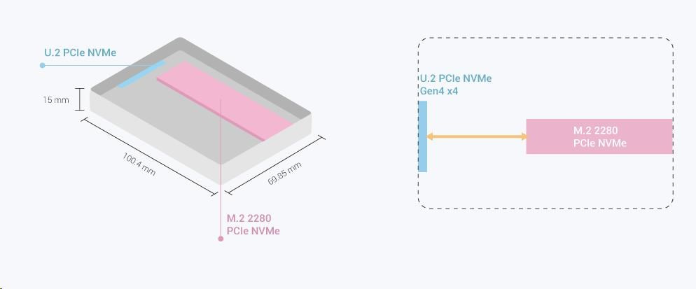 Produkt QDA-UMP4 umožňuje instalovat jeden M.2 PCIe 4.0 x4 NVMe SSD do 2,5” diskové pozice U.2 (SFF-8639) PCIe 4.0 x4 NVMe SSD. Pro zařízení QDA-UMP4 není potřeba žádný další software ani ovladače a lze jej nainstalovat do počítače/pracovní stanice (Windows®, Linux®) nebo QNAP NAS, aby bylo možné používat disky M.2 SSD jako cenově výhodnou alternativu drahých disků U.2 SSD.