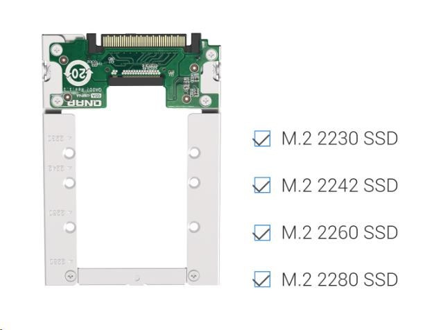 Lehký QDA-UMP4A umožňuje nainstalovat M.2 PCIe NVMe SSD do 2,5” slotu pro U.2 (SFF-8639) PCIe NVMe SSD zařízení QNAP NAS. (M.2 SSD se prodává samostatně)