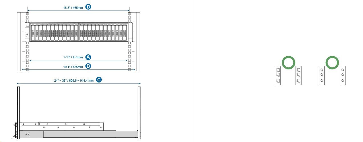 - Vzdálenost mezi dvěma rackovými sloupky (měření čtvercových otvorů racku střed-střed) je 18,3"(465 mm)