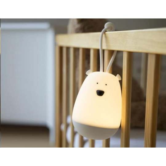 Lampička v podobě roztomilého medvídka, vyrobená z měkkého, bezpečného, certifikovaného a zdravotně nezávadného silikonu, je ideální první lampičkou i pro nejmenší děti, nočním světýlkem i snadno přenosnou lampičkou pro noční návštěvy toalety, na cesty. Dětskou lampičku jednoduše pomocí silikonové spony připevníte na rám postýlky a stejně jednoduše ji v případě potřeby sundáte.