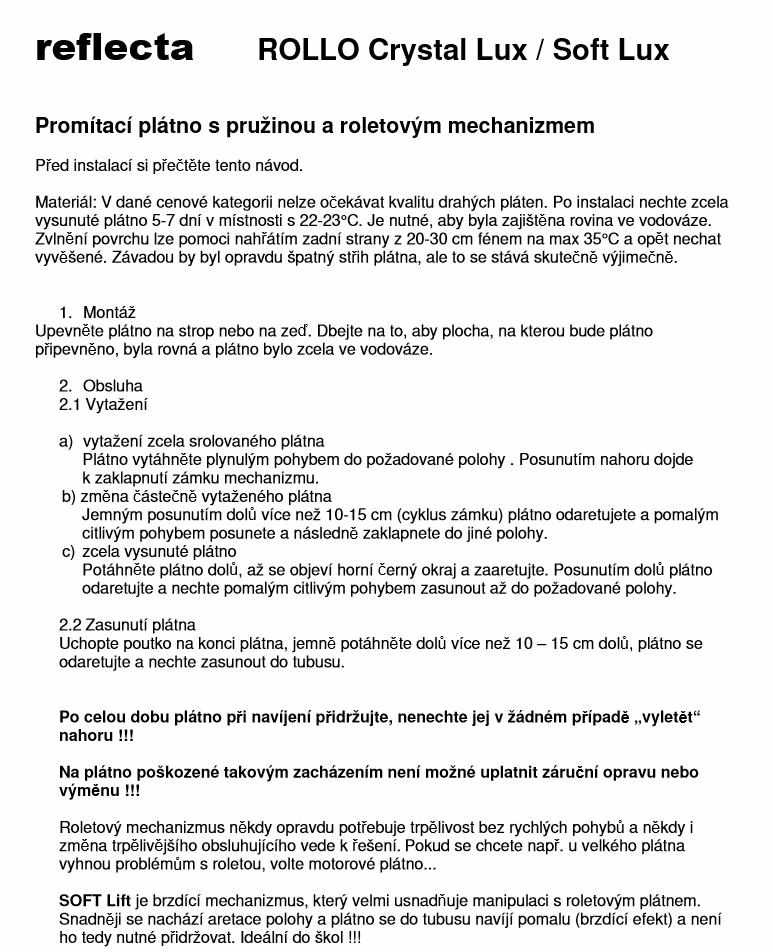 Roletové plátno ROLLO CrystalLine 240x240cm, viditelná plocha 236x236cm, 1:1, 131"/334cm, bílý hranatý kovový tubus 7x255cm/13kg, uchycení na stěnu nebo strop, materiál BetaLux - bílá 0,35 tkanina 300g/m2 s 2cm černým okrajem a zadní stranou, Gain=1,0, pozorovací úhel 120°. Lux - bílý matný povrch pro maximálně věrný a kontrastní obraz při alespoň částečném zatemnění. PVC materiál s textilním základem vytváří rovnou plochu bez zvlnění ale v krajích může docházet k prohnutí - postupně mizí. Snadné uchycení 4 vruty na plastových bocích plátna - stěna nebo strop. Možnost aretace polohy plátna při každé otáčce mechanizmu. Pozor při zpětném navíjení plátna je nutné plátno přidržovat - nesmí dojít k rychlému navinutí, které při nárazu na tubus může poškodit vnitřní mechanizmus bez možnosti uplatnění záruční doby..