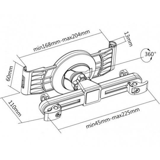 Držák pro tablety 7-11" v horizontální i vertikální poloze do auta pod opěrku hlavy. Určeno pro pasažery na zadním sedadle. Fixace ze dvou stran, otáčení tabletu o 360°, nastavitelná šíře uchycení 45-225mm, plastové provedení, bílý..