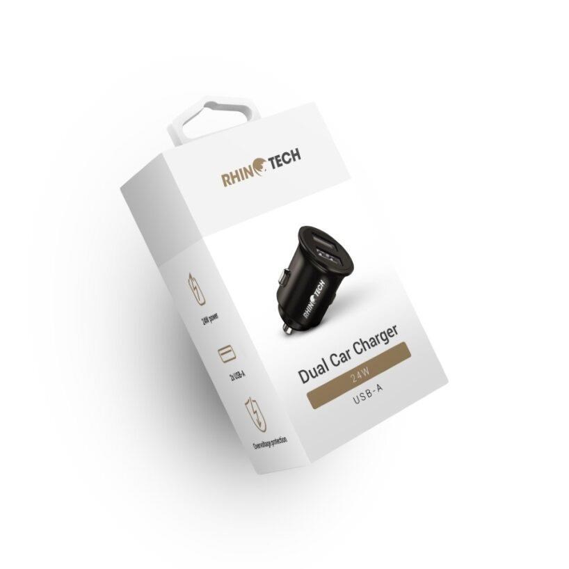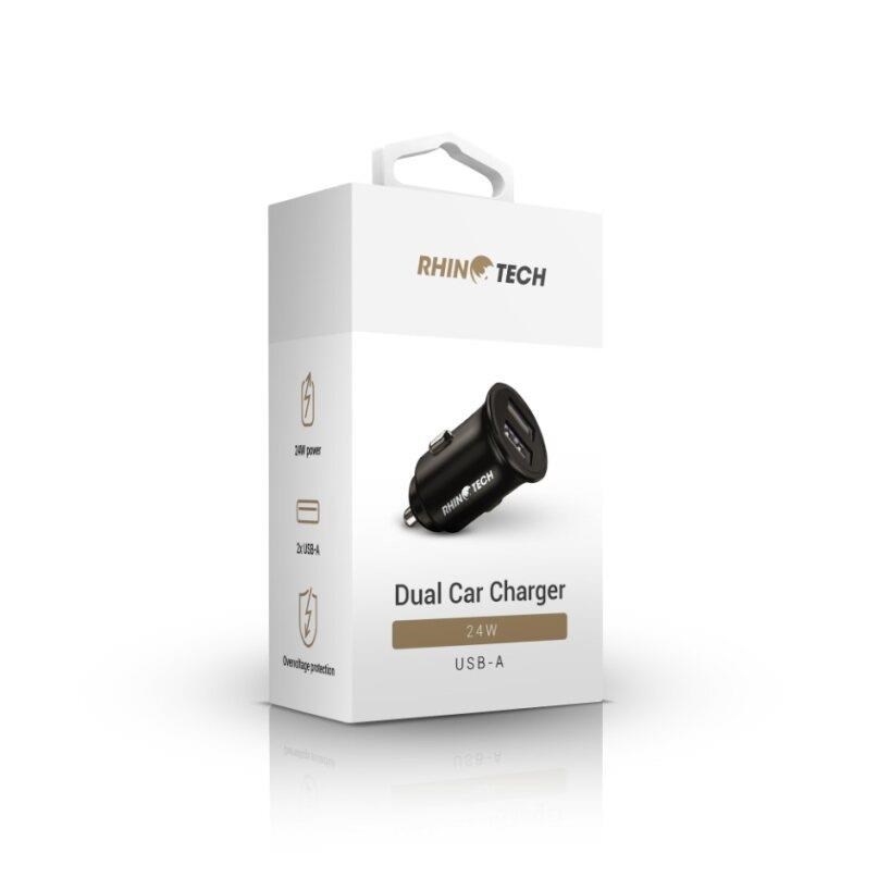 Nabíjecí duální adaptér RhinoTech pro nabíjení ve vozidle v kompaktních rozměrech a s celkovým výkonem 24W (12W + 12W).