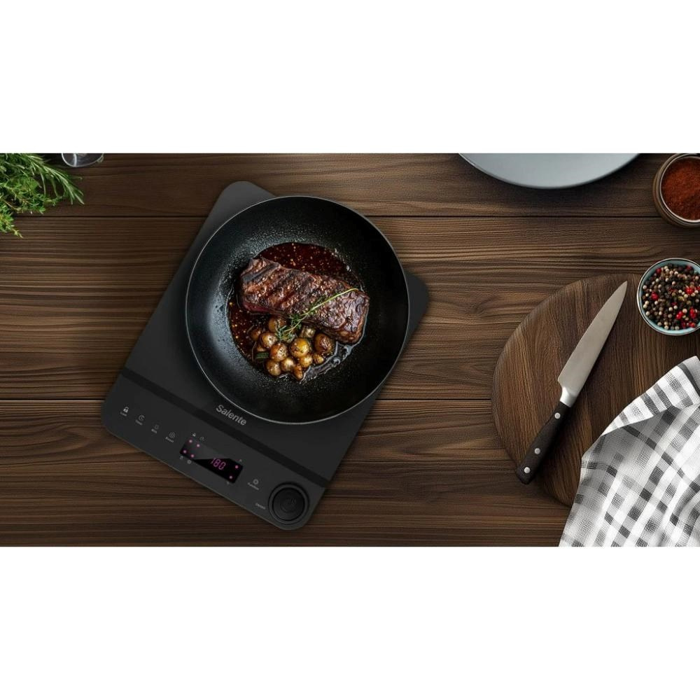 Indukční vařič Salente InductPro1 je perfektní volbou pro všechny, kteří chtějí vařit efektivně, úsporně a bezpečně. Je lehký, kompaktní a snadno přenosný, takže se hodí nejen do bytu, ale i na chalupu, do kanceláře či studentského bytu. Připojte ho k zásuvce, postavte na něj svůj oblíbený hrnec a nechte se unést chutěmi, které vytvoříte – snadno, rychle, úsporně a hlavně s radostí.