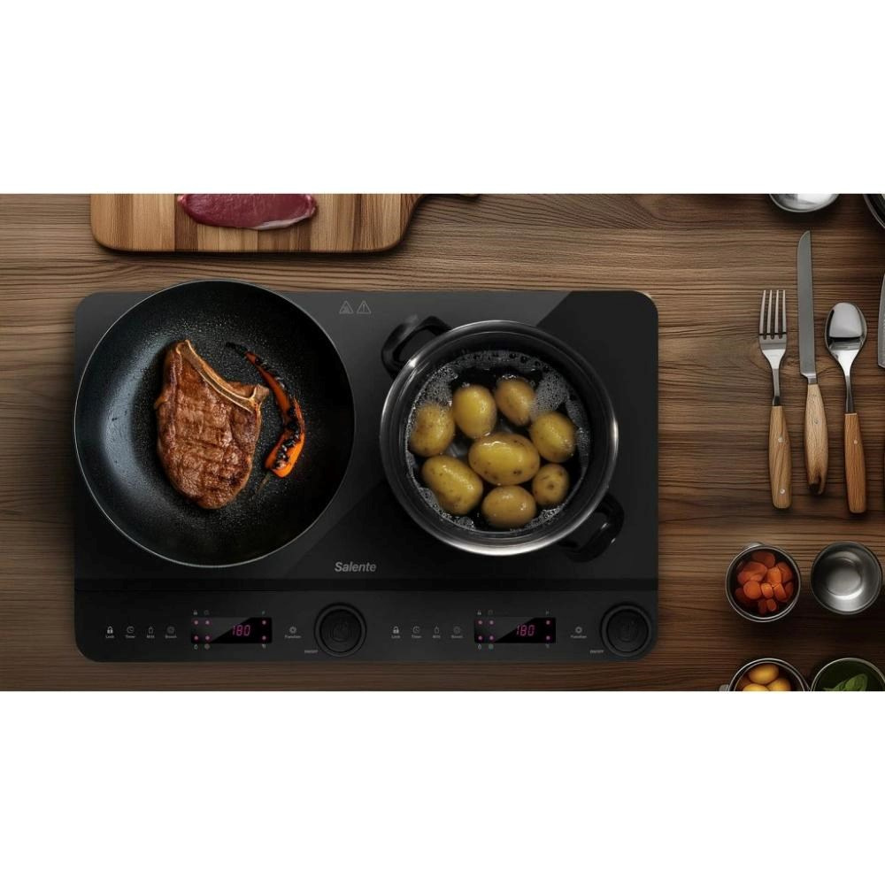 Každý pokrm vyžaduje jinou péči – někdy potřebujete jen jemné zahřívání, jindy pořádný žár. Obě plotýnky indukčního vařiče Salente InductPro2 vám proto nabízí 10 úrovní teploty (v rozsahu 60 až 240 °C) a 10 úrovní výkonu (až do 1300 W, resp. 1800 W). A pokud zrovna spěcháte, můžete se spolehnout na funkci Boost, která na 30 sekund zapne maximální výkon. Spolehlivý provoz tohoto kompaktního kuchyňského spotřebiče zajišťuje i autodiagnostika (monitorující případné problémy s indikací na displeji) nebo fakt, že ovládání i vaření je zde řízeno špičkovým mikroprocesorem.