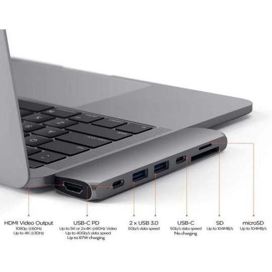 Po připojení získáte přístup až k 5 různým vstupům. První ze dvou USB-C konektorů je vybaven technologií Pass Through Charging jak pro 13" MacBook Pro, tak i pro 15" verzi a přenosem dat s rychlostí až 40 Gb/s, vedle toho nabízí hub ještě 2 USB-A 3.0 konektory, čtečku microSD i SD karet a v neposlední řadě je hub vybaven také HDMI portem, který zvládne přenos videa v rozlišení až 4K.