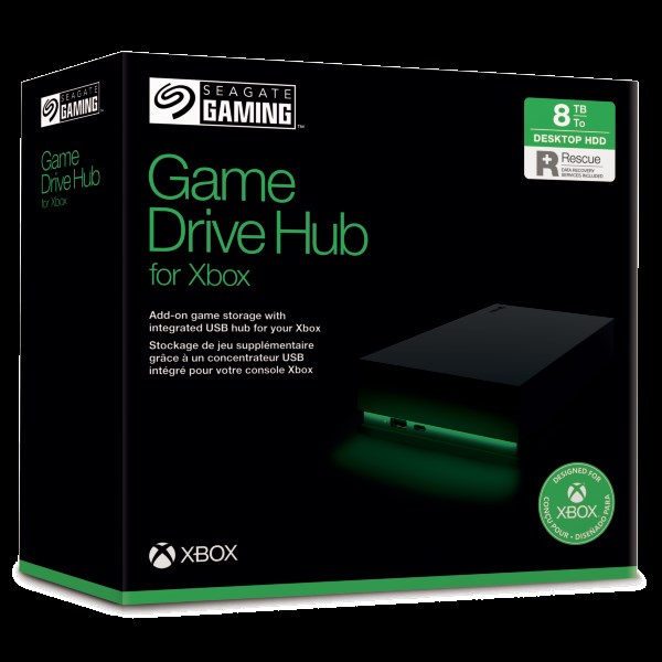 Ponořte se do hry s Game Drive Hub pro Xbox. Postavte si prémiový Game Vault s 8TB úložištěm, zatímco odvážný design hubu doplňuje celou vaši herní stanici Xbox. Vestavěný LED světelný pruh osvětlí vaše herní centrum zeleně, zatímco dva přední porty USB-C a USB-A udrží všechny vaše nezbytnosti nabité a připravené k provozu.
