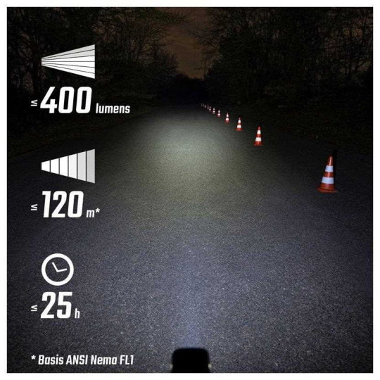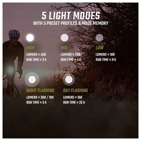 • 5 světelných režimů: High (400 lm), Mid (200 lm), Low (100 lm), Night Flashing (300/100 lm), Day Flashing (100 lm)
