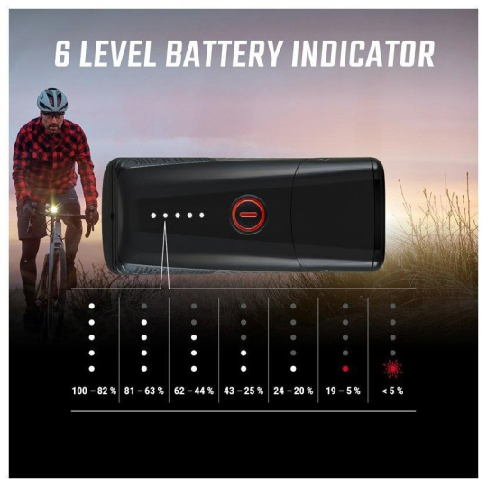 • Doba svícení: 2 h v režimu High, 7 h v režimu Low, 4.5 h v režimu Day Flashing, 6.5 h v režimu Night Flashing, 12 h v režimu Eco Flashing