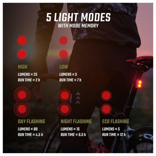 • 5 světelných režimů: High (25 lm), Low (5 lm), Day Flashing (80 lm), Night Flashing (15 lm), Eco Flashing (5 lm)