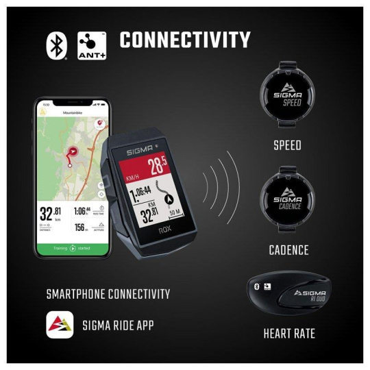 Pomocí technologií BLUETOOTH a ANT+ lze snadno a spolehlivě připojit sensory pro měření rychlosti, frekvence šlapání i tepové frekvence.