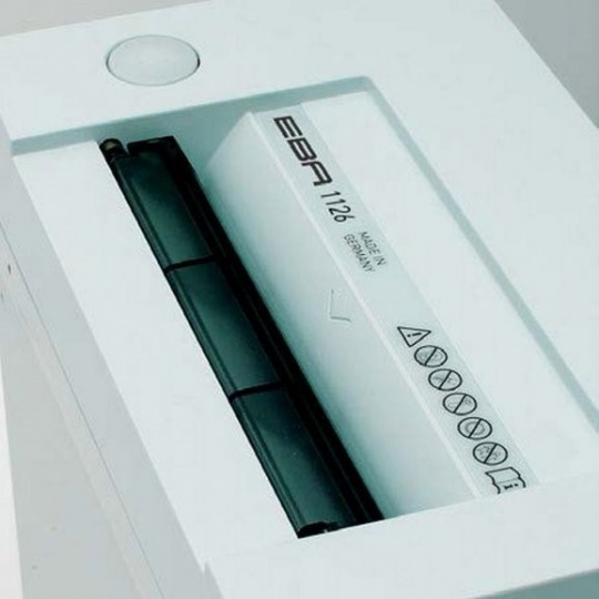 Energeticky úsporný osobní skartovač, vybavený řadou nejmodernějších technologií. Po 30-ti minutách ve stand-by režimu úplně odpojí odběr el. energie ze sítě. Automatické spuštění a vypnutí skartace fotobuňkou. Zpětný chod s automatickým vypnutím. Extrémně tichý chod motoru s výkonem 150W, vybavený jištěním proti přetížení. Multifunkční ovládací tlačítko EASY-Touch zajišťuje snadné, intuitivní ovládání, jednotlivé pracovní režimy jsou indikovány barevným světlem. Mechanická jistící klapka v místě vstupu skartovaného materiálu jako doplňující jištění přeplnění, současně pomáhá zabraňovat vstupu nevhodných materiálů (např. kravaty). Skartovací válce z tvrzené oceli, odolné proti kancelářským svorkám a sponkám ze HEAKATREZ. Moderní design stroje je spojený s funkčností. Po stranách skartovací hlavy a koše jsou průlisy pro snadné uchopení skartovací hlavy a následné vyprázdnění koše. Pracovní šířka 220 mm. Skartuje přímým řezem šíře 4 mm. Objem koše 20L. Kapacita skartace až 11–13 listů/70g, 9–11 listů/80g papíru. Napájení: 230 V / 50 Hz. Rozměry (V x Š x H): 428×345×213 mm. Hmotnost: 6,5 kg Tento stroj byl oceněný certifikátem „Modrý anděl“ udělovaným výrobkům šetrným k životnímu prostředí..