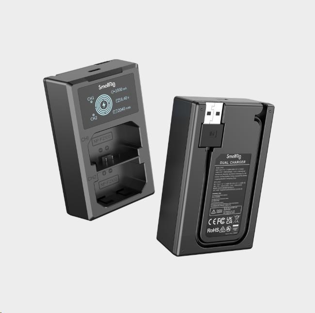 Duální nabíječka dokáže nabíjet dvě baterie současně, přičemž její LCD displej zobrazuje stav nabíjení v reálném čase.