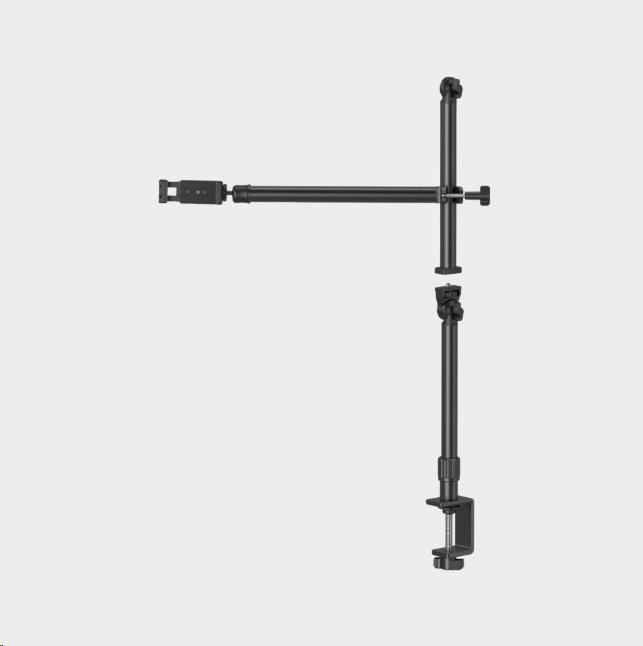 Držák může realizovat libovolné nastavení úhlu zařízení o 360° prostřednictvím kloubového ramene se třemi sekcemi (otáčení sekcí o 180°) a spodního knoflíku.