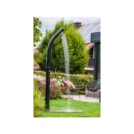 Designová solární sprcha s velkou sprchovací hlavicí, která zajišťuje příjemné sprchování připomínající lehký letní deštík. Elegantně zahnuté tělo sprchy, které vkusně zapadne do každé zahrady. Sprcha je vyrobena z kvalitního PVC odolného vůči UV záření, má zásobník o objemu 20 l a výšku 215 cm. Připojení na přívod vody je velmi jednoduché pomocí hadicové rychlospojky (součástí balení). Sprcha je dvoudílná, takže ji lze lehce složit a převézt na jiné místo.