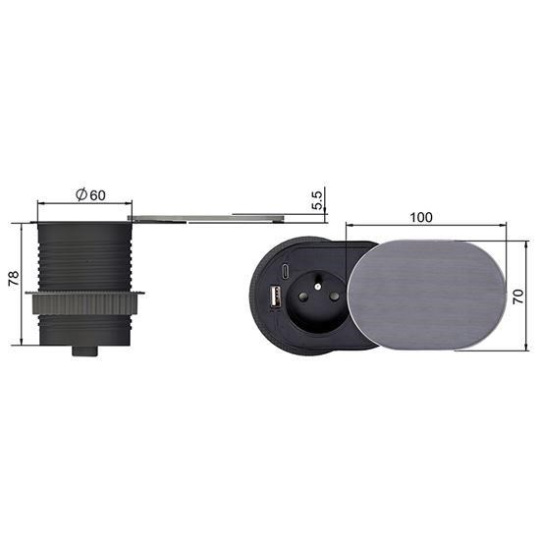 Instalace je jednoduchá a vyžaduje otvor o průměru 60 mm. Pod pracovní deskou má zásuvka hloubku pouze 76 mm, takže nezabírá mnoho prostoru. Připojení je zajištěno pomocí 2m PVC kabelu s úhlovou vidlicí. Tento kompaktní a funkční doplněk přináší pohodlí a moderní technologie přímo na váš pracovní stůl, ať už doma, nebo v kanceláři.