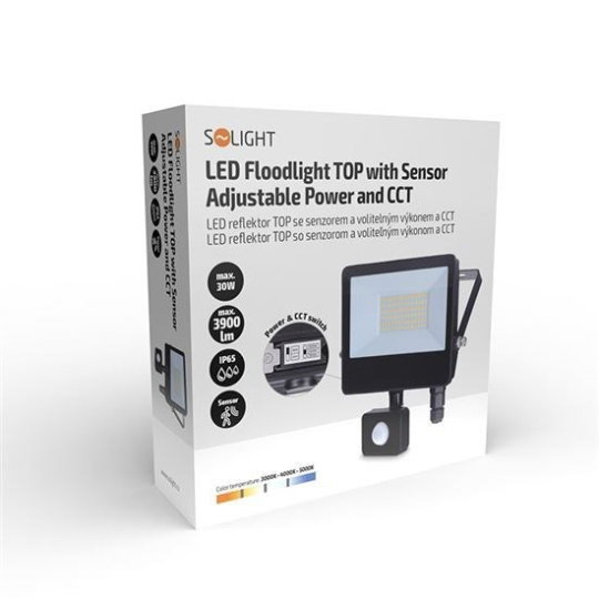 Solight LED reflektor se senzorem TOP, 30W, max. 3900lm, 3CCT, volitený výkon 100/66%, IP65, rychlospojka