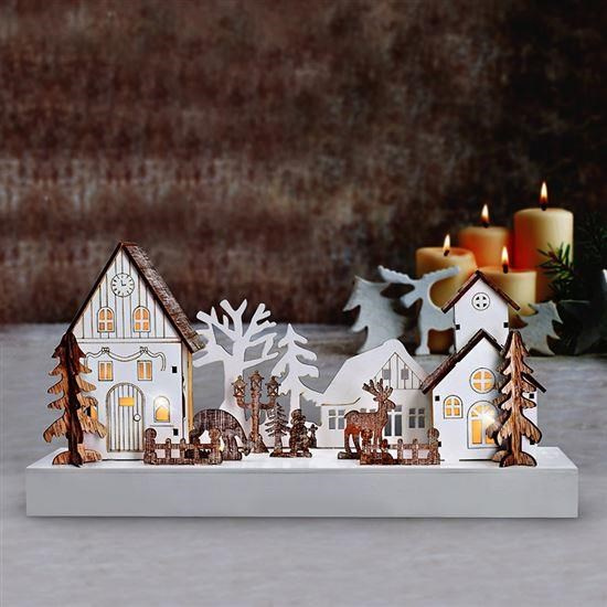 LED vánoční vesnička, počet LED diod: 4, barva světla: teplá bílá, napájení: 2x AA baterie (nejsou součástí), třída ochrany: IP20 (vnitřní použití), rozměry: 34 x 8 x 17cm, materiál: dřevo, barva: bílá, hnědá.... více