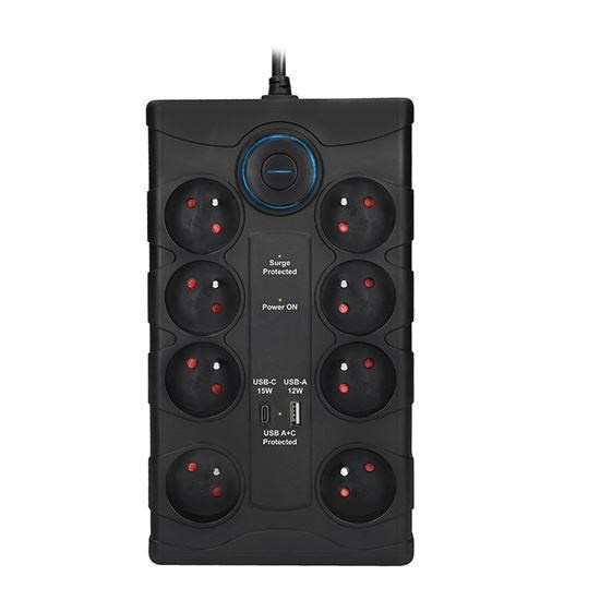Spolehlivá přepěťová ochrana s integrovanou USB nabíječkou chrání vaše zařízení proti náhlým výkyvům napětí. Díky osmi zásuvkám a dvěma USB portům je ideální do domácnosti i kanceláře. S maximální zátěží až 3680 W zvládne i energeticky náročnější spotřebiče.