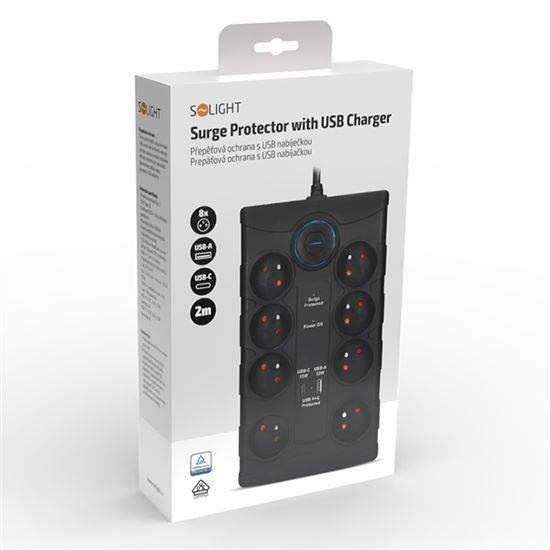 Solight přepěťová ochrana, 8z, USB A+CA, 2m, černá