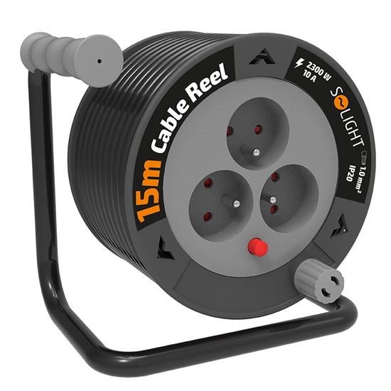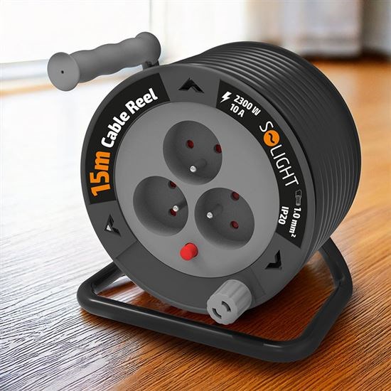 Solight prodlužovací přívod na bubnu 15m, 3 zásuvky, černý kabel, 3x 1,0mm2