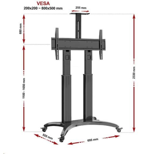 Televizní stojan na videokonference NB AVF1800B Profesionální stojan na televize a monitory 50-90", ideální na videokonference nebo prezentace, výškové nastavení 110-165cm, polička na kameru, pojízdný, nosnost 56,8kg Televizní stojan ideální na videokonference nebo prezentace - vhodný pro zavěšení televizorů nebo monitorů s úhlopříčkou 50-90" a nastavení do požadované výšky od 110cm do 165cm (výška po střed obrazovky). Pro umístění kamery je na stojanu polohovatelná polička s rozměry 255x125mm a nosností 4,5kg. Stojan vyniká kvalitou, designem a snadným nastavením. Veškerou kabeláž je možné vést skrytě tělem stojanu. Vyroben je z hliníku, kolečka jsou osazena brzdou. Barevné provedení černé, záruka 5 let. Televizní stojan na videokonference NB AVF1800B Technické údaje: nosnost 56,8kg na televize a monitory 50-90" podporuje VESA standardy 200x100 až 800x400 plynulé nastavení rozsahu výšky 1100 - 1650mm (výška od podlahy po střed obrazovky) horní polička na kameru 255x125mm, nosnost 4,5kg systém pro skryté vedení kabeláže hliníková konstrukce i podstava profesionální pojezdová kolečka, všechny jsou osazeny brzdou nejvyšší kvalita, snadné nastavení, maximální bezpečnost barevné provedení černé záruka 5 let Stojan na videokonference, přednášky a propagace s nastavením výšky Tv 110-165cm NB AVF1800BStojan na televize a monitory NB AVF1800B je dodáván včetně horní poličky na kameru s nosností 4,5kg Tv stojany AVF1800B podporují VESA standardy: VESA 200x100 VESA 200x200 VESA 300x200 a 200x300 VESA 300x300 VESA 400x200 a 200x400 VESA 400x300 a 300x400 VESA 400x400 VESA 600x200 VESA 600x300 VESA 600x400 VESA 800x400 VESA 800x500 Stojany na Tv NB AVF1800B jsou ideální pro využití na videokonferencích, přednáškách nebo propagacích. Své uplatnění našli především ve firmách, školách, na výstavách ale i pro soukromé účely v domácnostech..