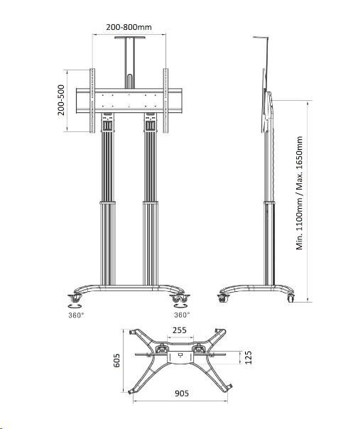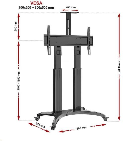 Televizní stojan na videokonference NB AVF1800B Profesionální stojan na televize a monitory 50-90", ideální na videokonference nebo prezentace, výškové nastavení 110-165cm, polička na kameru, pojízdný, nosnost 56,8kg Televizní stojan ideální na videokonference nebo prezentace - vhodný pro zavěšení televizorů nebo monitorů s úhlopříčkou 50-90" a nastavení do požadované výšky od 110cm do 165cm (výška po střed obrazovky). Pro umístění kamery je na stojanu polohovatelná polička s rozměry 255x125mm a nosností 4,5kg. Stojan vyniká kvalitou, designem a snadným nastavením. Veškerou kabeláž je možné vést skrytě tělem stojanu. Vyroben je z hliníku, kolečka jsou osazena brzdou. Barevné provedení černé, záruka 5 let. Televizní stojan na videokonference NB AVF1800B Technické údaje: nosnost 56,8kg na televize a monitory 50-90" podporuje VESA standardy 200x100 až 800x400 plynulé nastavení rozsahu výšky 1100 - 1650mm (výška od podlahy po střed obrazovky) horní polička na kameru 255x125mm, nosnost 4,5kg systém pro skryté vedení kabeláže hliníková konstrukce i podstava profesionální pojezdová kolečka, všechny jsou osazeny brzdou nejvyšší kvalita, snadné nastavení, maximální bezpečnost barevné provedení černé záruka 5 let Stojan na videokonference, přednášky a propagace s nastavením výšky Tv 110-165cm NB AVF1800BStojan na televize a monitory NB AVF1800B je dodáván včetně horní poličky na kameru s nosností 4,5kg Tv stojany AVF1800B podporují VESA standardy: VESA 200x100 VESA 200x200 VESA 300x200 a 200x300 VESA 300x300 VESA 400x200 a 200x400 VESA 400x300 a 300x400 VESA 400x400 VESA 600x200 VESA 600x300 VESA 600x400 VESA 800x400 VESA 800x500 Stojany na Tv NB AVF1800B jsou ideální pro využití na videokonferencích, přednáškách nebo propagacích. Své uplatnění našli především ve firmách, školách, na výstavách ale i pro soukromé účely v domácnostech..