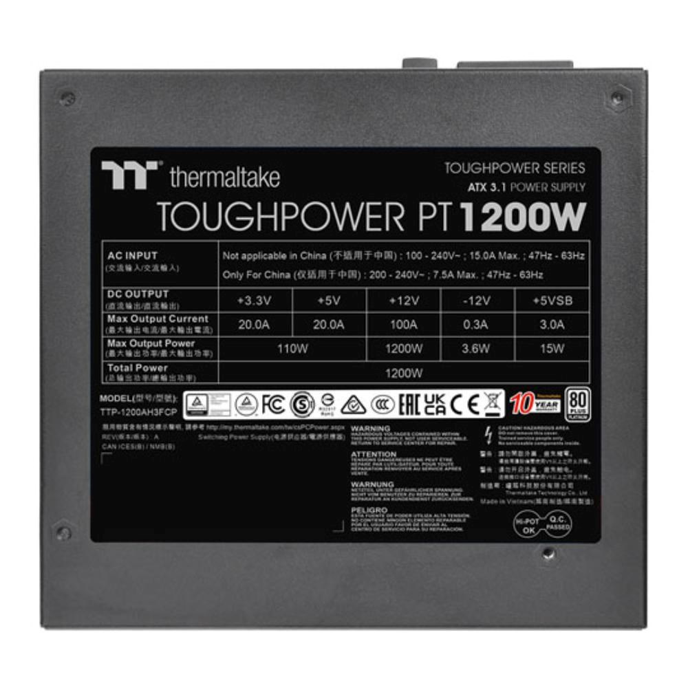Toughpower PT 1200W Platinum je kompatibilní s ATX 3.1, má certifikaci 80 PLUS Platinum a podporuje nativní PCIe Gen 5.1 (12+4pin) pro napájení nové generace grafických karet. Poskytuje 1200 W nepřetržitého výkonu při 40 °C.