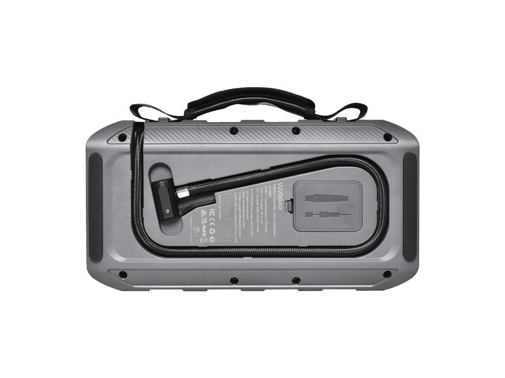 Představujeme V2200air, špičkové multifunkční zařízení pro každého řidiče. S tímto všestranným pomocníkem snadno nastartujete vůz, nafouknete pneumatiky, nabijete elektroniku a osvětlíte okolí. Díky špičkovému startovacímu proudu 2200 A zvládne během 2 sekund nastartovat motory až o objemu 8.0 l (benzín) nebo 6.0 l (diesel). Integrovaný vzduchový kompresor zvládne pneumatiky nafouknout za méně než 3 minuty. S V2200air jste připraveni na každou situaci, ať vás potká cokoli.