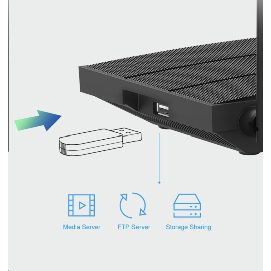 - USB port pro připojení flash disku či HDD (media server, storage sharing, FTP server)