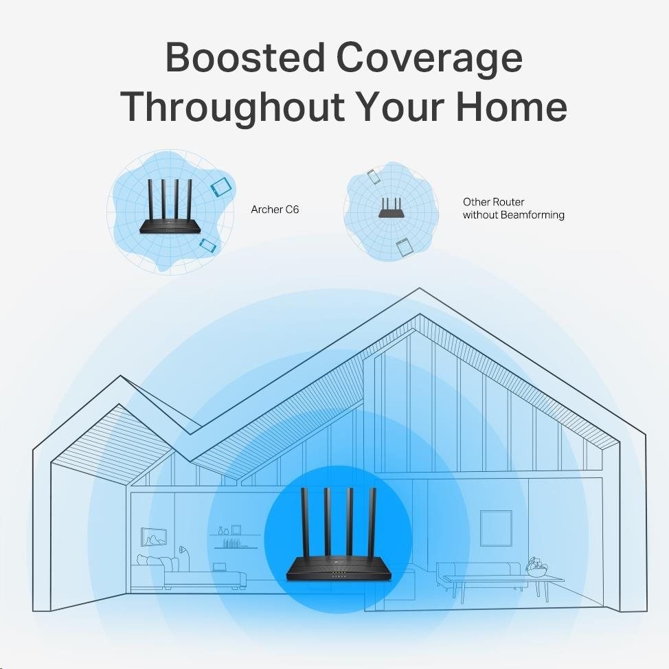 Router Archer C6 vytváří spolehlivou a bleskově rychlou síť s technologií Wi-Fi 802.11ac. Pásmo 2,4 GHz poskytuje rychlost až 300 Mbit/s, která je připravena pro každodenní úkoly, jako je odesílání e-mailů a prohlížení webu, zatímco pásmo 5 GHz poskytuje rychlost až 867 Mbit/s, což je ideální pro streamování HD videa a hraní on-line her bez zpoždění.